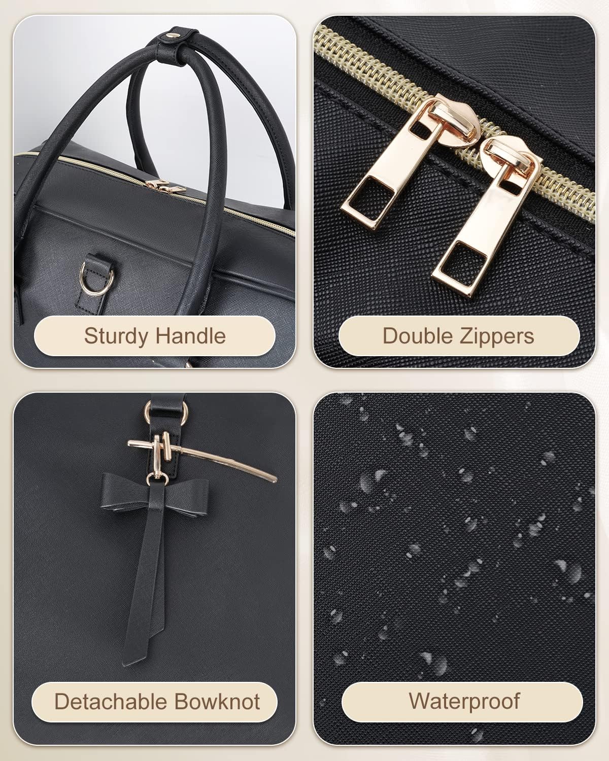Professional Design: Top sturdy handle with buckle provides portable carrying experience. This businesses laptop bag has a zippered back pocket for your important item like passport, plane ticket, wallet. Stretchable key chain inside the shoulder bag can help get your keys easily when opening door, save your time. And it has 1 external detachable cute bowknot attached. Reinforced flat bottom with 4 rivets will reduce friction and scrape of bottom of the 17.3 inch computer bag