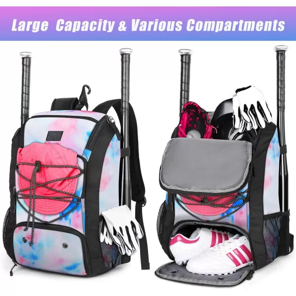 HOLD ALL BATTING GEARS: The dimensions of tie dye baseball bag is 18*13*7.5 inch and capacity is 29L. The softball bat bag has various pockets for keeping your gears, 2 side pockets holds bats securely and 2 water bottles mesh pockets, a spacious main compartment and many functional pockets for helmet, batting mittens, shoes, teeballs and everything you need for winning game