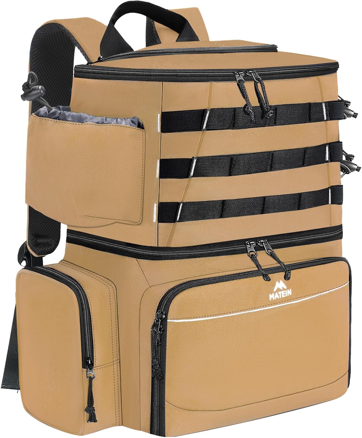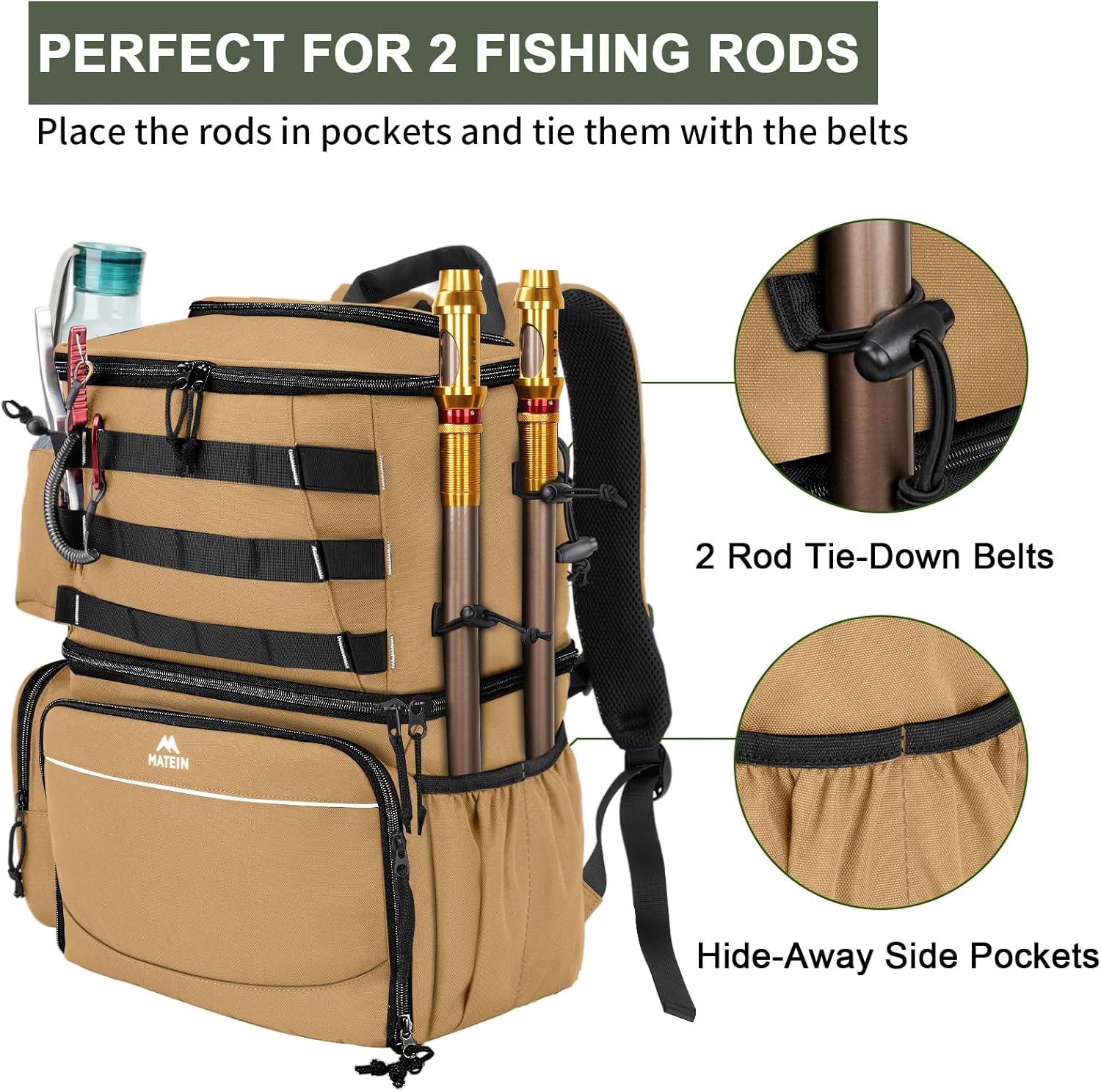 MATEIN Fishing Backpack, Water Resistant Fishing Tackle Box Bag with Rod Holders & Cooler, Gear Gifts for Men(Khaki)