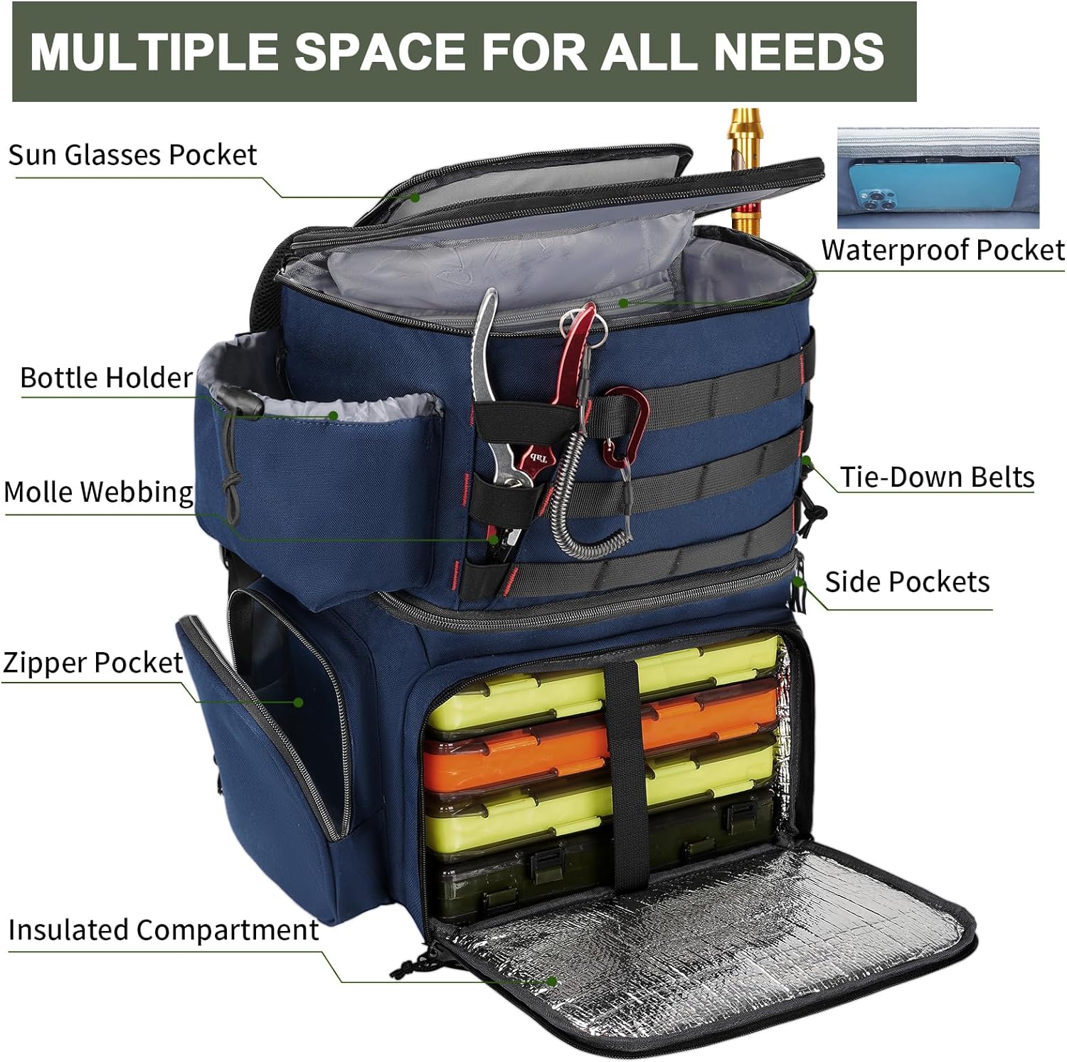 Dual Structure with Cooler: The fishing backpack builds a large front-loading cooler compartment that can hold four 3600 tackle boxes. It has a double-zipper in the middle for easy access to trays