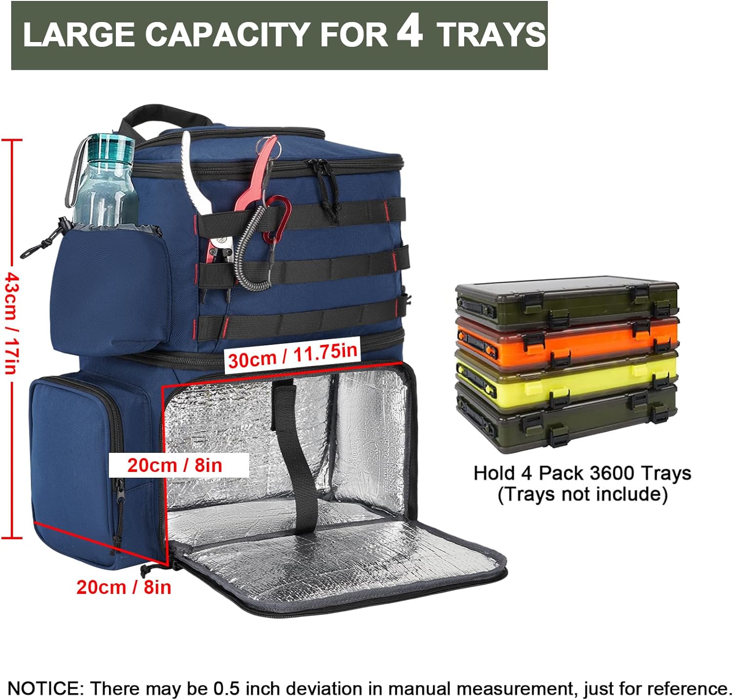 MATEIN Fishing Tackle Backpack with Cooler Large Fishing Bag with Rod Holders for 4 Trays Tray Not Included  Fishing gearBlue