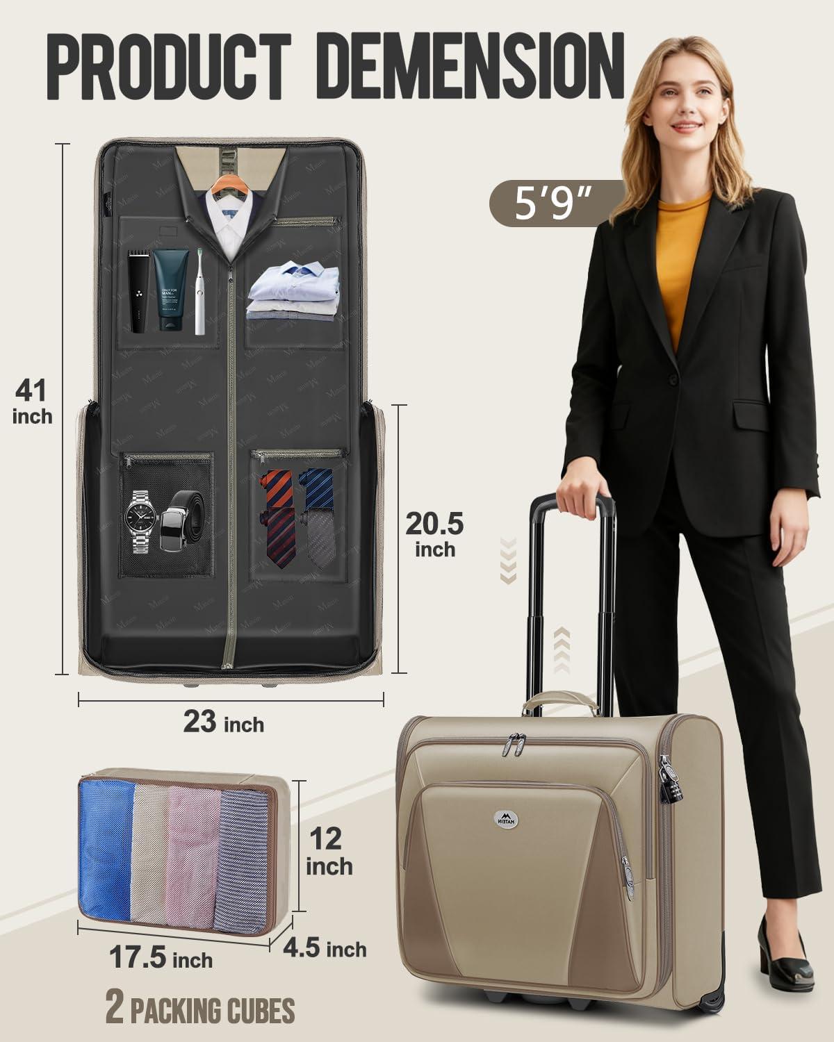 TIMELESS STYLE FOR EVERY OCCASION: Designed with business professionals in mind, this wheeled garment bag suitcase opens to 22.5″” (W) x 41″” (L) and folds to 23″” (L) x 9″” (W) x 20.5″” (H). It complies with the checked luggage limits dimension allowance but doesn’t meet most standard carry-on size. Whether for personal vacation, weekend getaway, leisure travel, or any travel where wrinkle-free clothes are a must, this rolling garment bags are the perfect companion