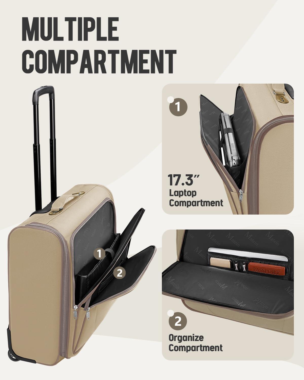 WRINKLE-FREE GARMENT TRAVEL COMPANION: Keep your clothes wrinkle-free with this well-designed garment compartment. Equipped with 4 loop holders, 2 tie-down straps, and a padded middle strap, it securely holds up to 4 suits. The wide-opening design provides easy access, while the reinforced interior prevents shifting and keeps items organized. Perfect for business trips or formal events, this wheeled garment bags ensures your attire remains pristine, so you can always make a great impression