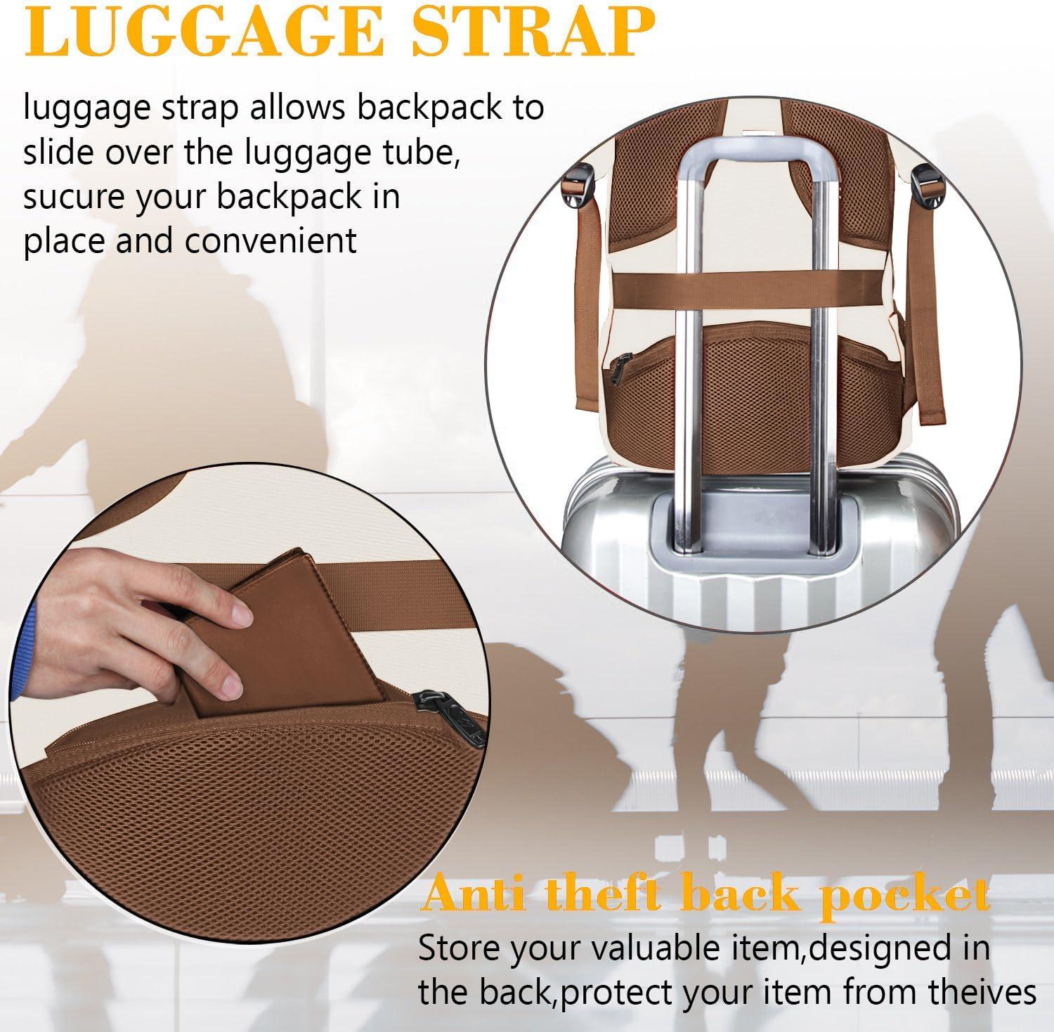 FUNCTIONAL & SAFE: Dimensions: 18*12*7.8 inches. A luggage strap allows travel laptop backpack fit on luggage/suitcase, slide over the luggage handle tube for easier carrying. With a hidden anti theft pocket on the back protect your valuable items from thieves. Well made for international airplane travel and day trip using
