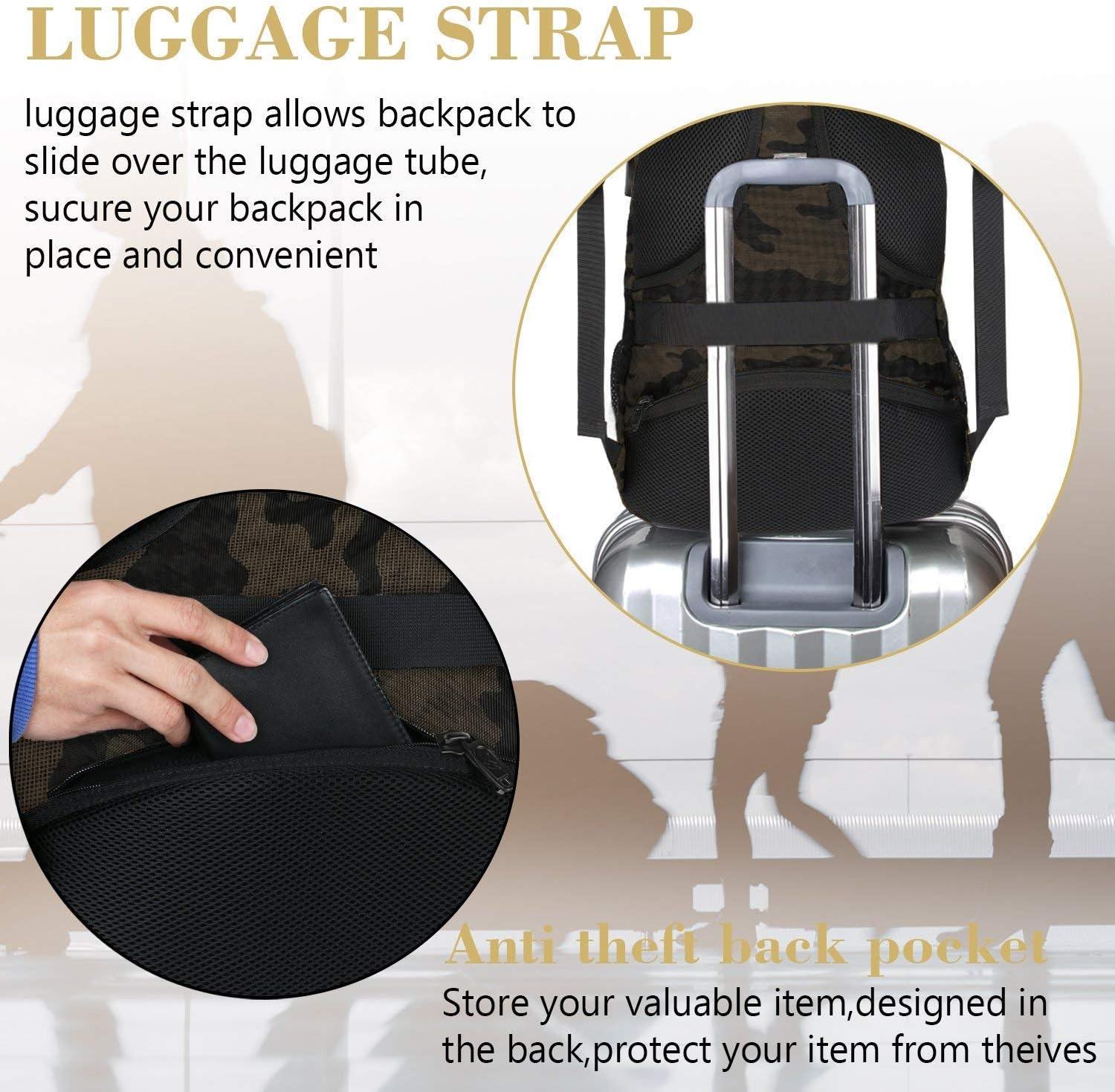 FUNCTIONAL & SAFE: Dimensions: 18*12*7.8 inches. A luggage strap allows travel laptop backpack fit on luggage/suitcase, slide over the luggage handle tube for easier carrying. With a hidden anti theft pocket on the back protect your valuable items from thieves. Well made for international airplane travel and day trip using
