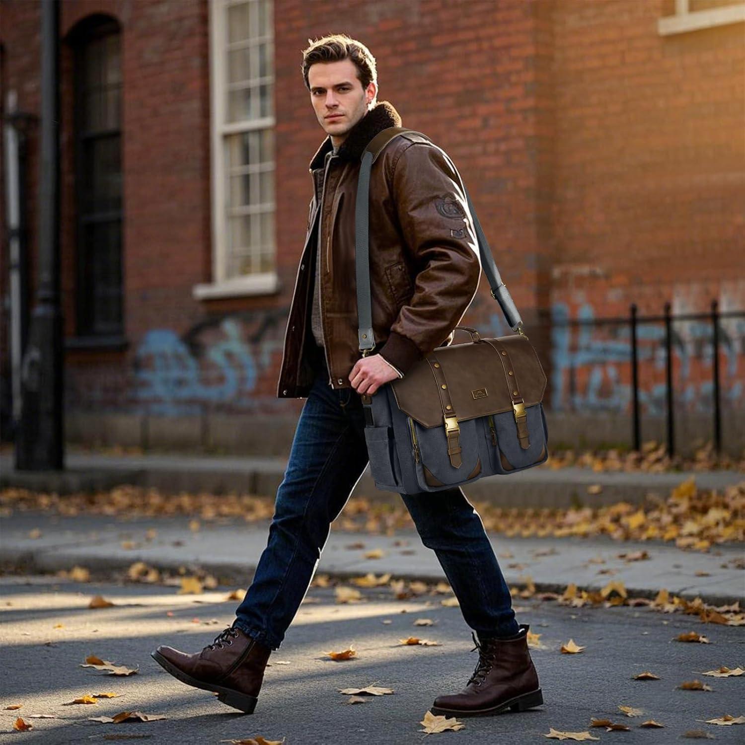 This Vintage Messenger Bag masterfully blends industrial-era aesthetics with cutting-edge functionality. Built from water-resistant canvas and reinforced with abrasion-resistant PU trim, vintage 15.6 inch laptop Bag rugged exterior features antique bronze hardware—including distressed zippers, rivets, and a signature clasp lock—that ages gracefully while enduring daily demands. The reinforced stitching and triple-layer corner guards ensure longevity. Our canvas briefcase for men combines classic craftsmanship with modern utility. Stay connected through its USB charging port (external power bank required), discreetly linked to the inner pocket. Designed as a functional messenger bag with USB port, it adapts effortlessly: detachable straps, ergonomic handles, and a vintage work bag aesthetic. The canvas laptop bag combines rugged durability with minimalist design, while the leather messenger bag elevates your style with timeless craftsmanship. Designed as a spacious 15.6 inch work bag, it seamlessly organizes essentials for daily commutes or work. RFID-blocking hidden pockets guard against digital theft, and the back luggage sleeve ensures effortless transit. Clean lines meet heritage-inspired resilience—crafted for professionals navigating work, college, and beyond. EfficIent Organization System With 14 intelligently designed compartments, this Leather laptop bag for men conquers clutter: Front Quick-Draw Zone: Lockable zipper pocket + 2 organizational panels with key ring and pen slots Side Pockets: Water bottles or compact umbrellas Main Compartment: Padded laptop compartment, tablet sleeve, and document folders Wet Pocket: Store wet items without getting other items wet Measuring 15.35*5.51*12.9 inches (LxHxW) and weighing just 3.2lbs, this canvas work bag for men transitions effortlessly from campus to boardroom. The vintage crossbody bag is the perfect gifts for Valentine's Day, birthdays, Teacher's Day, graduation ceremonies, and other occasions.