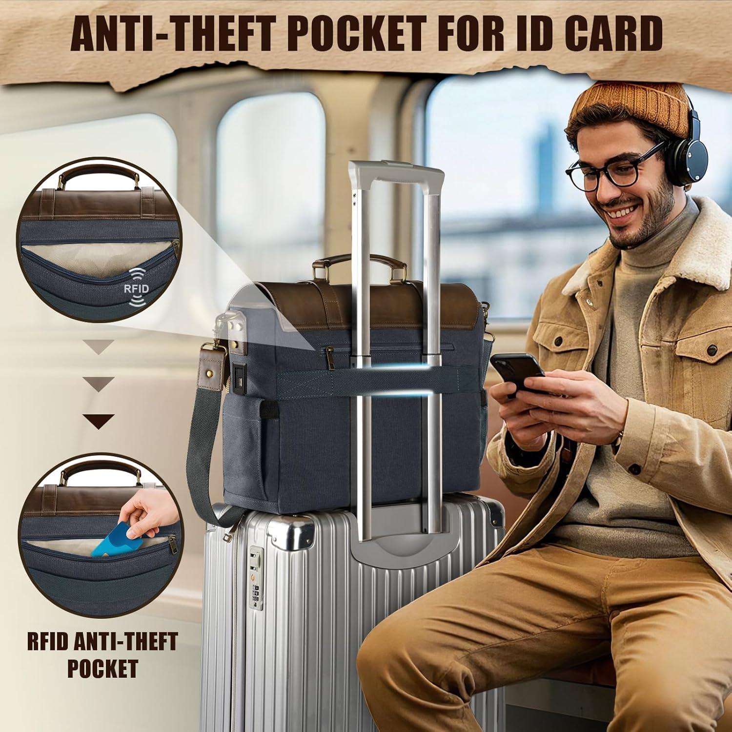 USB Charging Port & Easy to Carry: Vintage work bag is designed with a USB charging port on the side (mobile power supply is not included), which is convenient for charging electronic devices and meets the need of modern youth's fast-paced commuting. The back luggage strap can fix the canvas briefcase on the luggage, freeing your hands for daily commuting. Vintage Computer bag with reinforced PU handles and adjustable detachable shoulder strap for comfort and versatility, making traveling easier